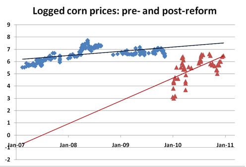 The two panels below report data on prices for rice and corn. The charts indicate that prices have risen to roughly 35-40 percent of their pre-reform trend line, suggesting that excess growth in the money supply has undone a significant share of the reform. And grain price inflation has accelerated significantly, from an annual rate of 35-40 percent before the reform, to 500-600 percent over the past year.