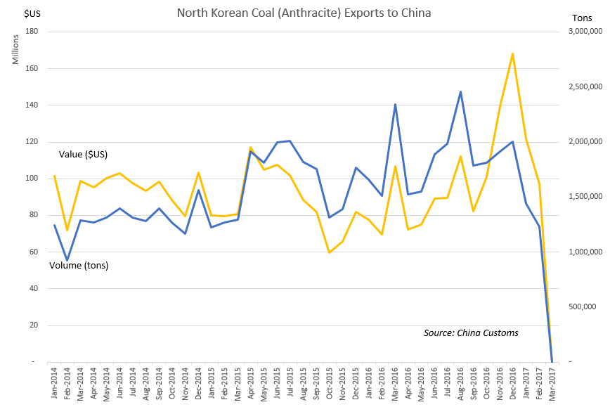 In February, China announced that it was cutting off all coal imports from North Korea for the rest of the year effective immediately. The move was somewhat of a surprise, as it seemed to exceed commitments under UNSC Resolution 2321, which appeared to allow a somewhat more generous cap. China Customs has now released trade data for March, and sure enough, they report zero coal imports from North Korea, a $97 million drop in one month. And as I noted last month, other evidence suggests that North Korean coal shipping operations have been disrupted.