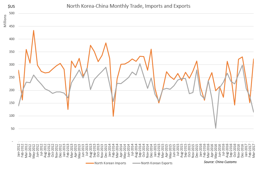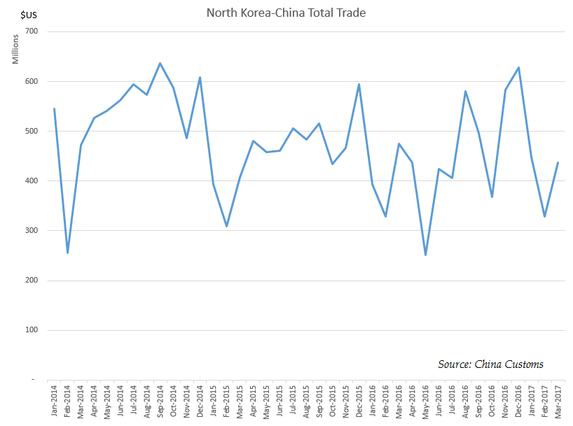 On the other side of the ledger, it does not appear that the sanctions are having any effect on China’s exports to North Korea. In fact, in March 2017, North Korea recorded the largest monthly trade deficit since December 2009, the month of the DPRK’s botched currency redenomination. March is just one month, but North Korea has run annual trade deficits with China for the last several years; According to the latest KOTRA report, the deficit was $743 million in 2015. Because North Korea is able to run a trade deficit China Customs’ monthly figures for total China-North Korea trade (see below) do not yet show a noticeable drop. And because China does not publish crude oil exports to China, these overall trade figures, and particularly North Korea’s deficit, are artificially low. (See last week’s report by Chen Aizhu at Reuters on China’s oil lifeline to North Korea.)