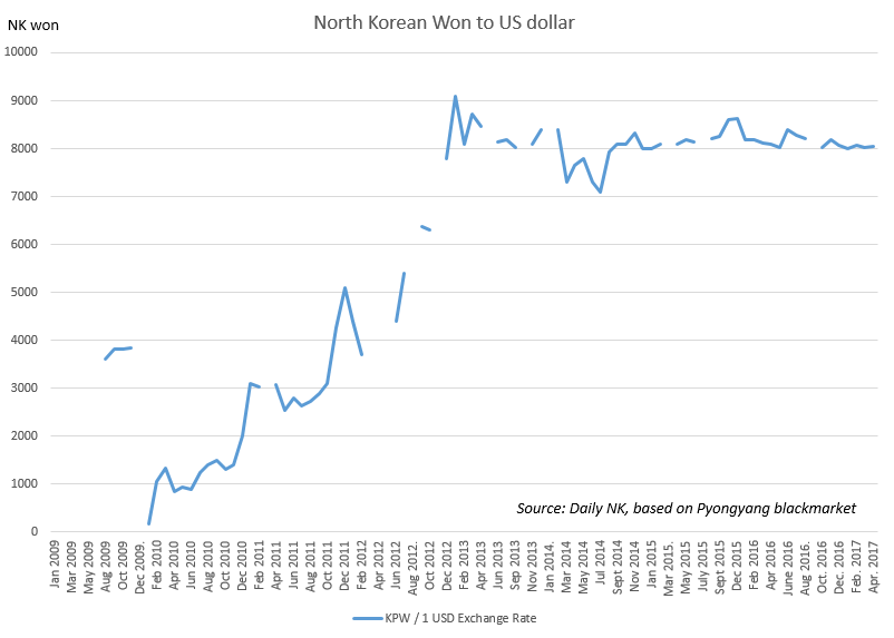 How long can North Korea fund a large, and expanding trade deficit? If China really is turning the screws on North Korean exports—and barring major cash reserves or significant other means to generate cash—then the DPRK would eventually face balance of payments difficulties, which would have repercussions across the economy and lead to a depreciation of the North Korean won. Despite news of an uptick in gas prices in Pyongyang, the enduringly stable unofficial won rate (below) suggests this is not happening yet, at least not in the black markets where average North Koreans have their ears to the ground.