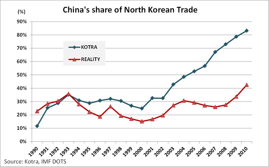 The upshot is that the prominence of the trade partners that KOTRA does count is greatly exaggerated. The New York Times and Washington Post, for example, have both reported that China accounts for 80 percent of North Korea’s trade; even with smuggling that is wildly exaggerated given the ongoing important of Kaesong for North Korea’s balance of payments.