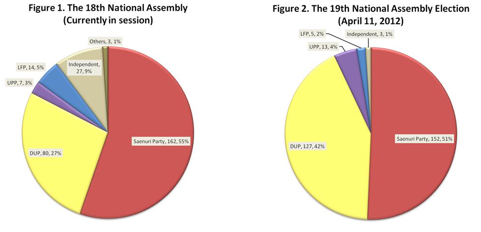 Before turning to some analysis, some election law basics and the headline numbers. The National Assembly is a unicameral legislature that sits on a four year cycle that is non-concurrent with the five year presidential election cycle. The two elections just happen to fall in the same year in 2012, with the presidential elections coming up in December; thus the heightened interest. All 300 seats were contested, 246 district seats decided by plurality and 54 from party lists allocated according to the share of the separate party list votes. The math is easy: 151 legislators are needed to have an outright majority or to form a majority coalition. The ruling Saenuri party enjoyed an outright majority in the 18th Assembly with about 55% of the seats. The DUP held 27% with the remainder split between small parties and independents. In advance of the elections, however, the DUP formed an electoral alliance with the United Progressive Party by agreeing to field a single candidate in each of the district elections to avoid vote-splitting. The picture was further complicated by the late entry of a number of small parties and independents as well.
