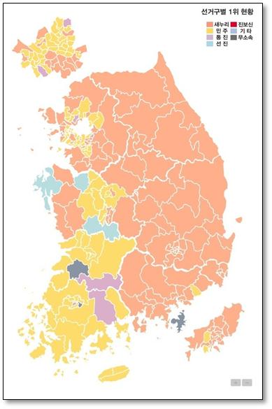 Regionalism has long played an important role in Korean politics, with a long-standing split between the southwest (Cheolla Province, or Honam)—where the DUP (yellow) and the UPP (purple) dominated--and the southeast (Kyongsang Province, or Yongnam and including both Taegu and Pusan) where the Saenuri (red) won; the conservatives also won in the more sparsely populated northeast districts. Perhaps with the exception of Kangwon, this outcome was not a big surprise. But given its tremendous size, metropolitan Seoul should now be considered a distinctive “region” in its own right. The DUP and the UPP came out with a healthy victory in Seoul, taking 30 and 2 seats respectively while the Saenuri only took 16, most of them being concentrated around Kangnam where most of the wealthy, conservative, neighborhoods are located (the small inset).