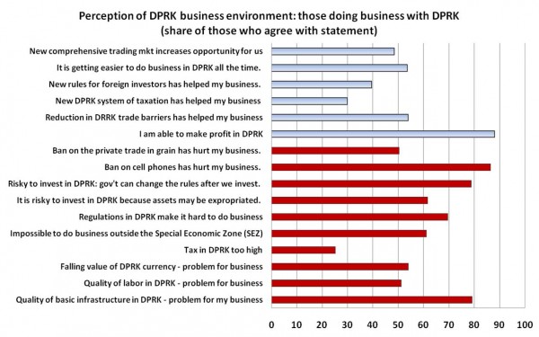 Sadly, our survey of Chinese enterprises suggests that the business climate in North Korea may not be too healthy. While the vast majority of our respondents report that they are making money, they complain vociferously about physical infrastructure and the regulatory environment. (Sound familiar?)