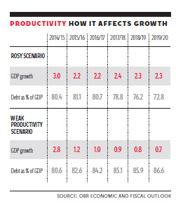 The OBR's table 5.7 sets out what the United Kingdom would look like under what they call their weak productivity scenario as well as what I call their rosy scenario. They consider the implications of growth in actual productivity remaining at ½ percent, which was the average growth rate since 2008. The rosy scenario assumes productivity gradually rises to 2 percent by 2019. This assumption that the productivity conundrum is magically solved, the OBR says, "is the most important and uncertain judgment in our economy forecast." Of course it's also the forecast's greatest potential weakness.