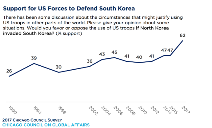 The most comforting finding was evidence of increased support for the alliance. This is exactly the opposite of the fear that the US would think twice about defending the South in the face of a nuclear North. It also suggests that President Trump’s idiosyncratic views of the Asian alliances during the campaign have not dented public support; to the contrary.