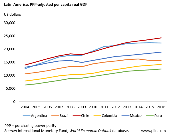 Another way to measure the gravity of Brazil's problems is to compare the evolution of GDP per capita on a purchasing power parity basis to that of its regional peers. As the figure below shows, among the largest economies in Latin America, Brazil is the only country projected to see a drop of 3.5 percent in PPP-adjusted per capita GDP by the end of this year. Even troubled Argentina is expected to fare better than Brazil, according to data from the IMF.