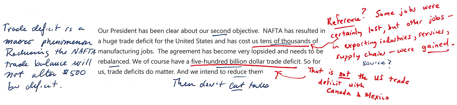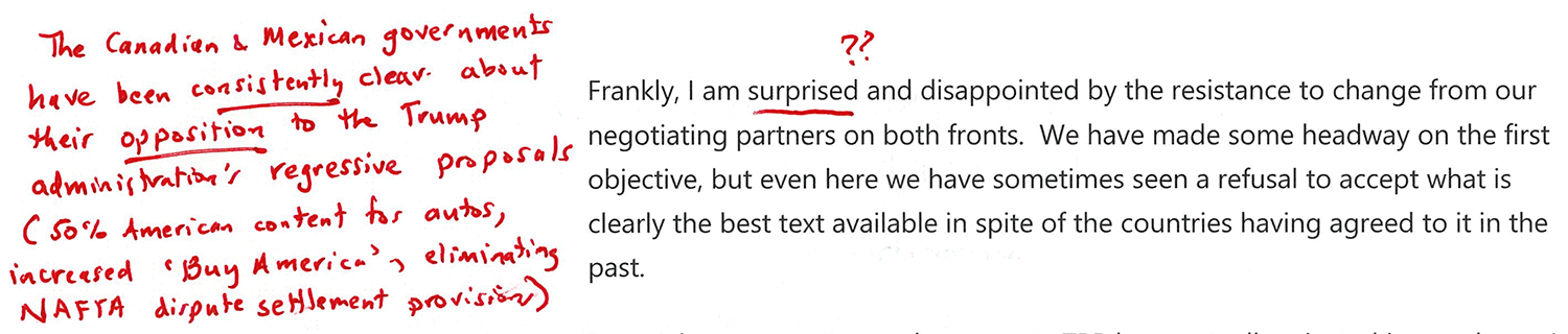 US Trade Representative Robert Lighthizer declared in his closing remarks at the NAFTA renegotiations in October 2017: "I am surprised and disappointed by the resistance to change from our negotiating partners on both fronts." PIIE trade experts Chad P. Bown and Caroline Freund explain, in their own handwritten notes on his statement, why he at least should not have been surprised. Click on the notes to zoom in, then hit your browser's back button to return.