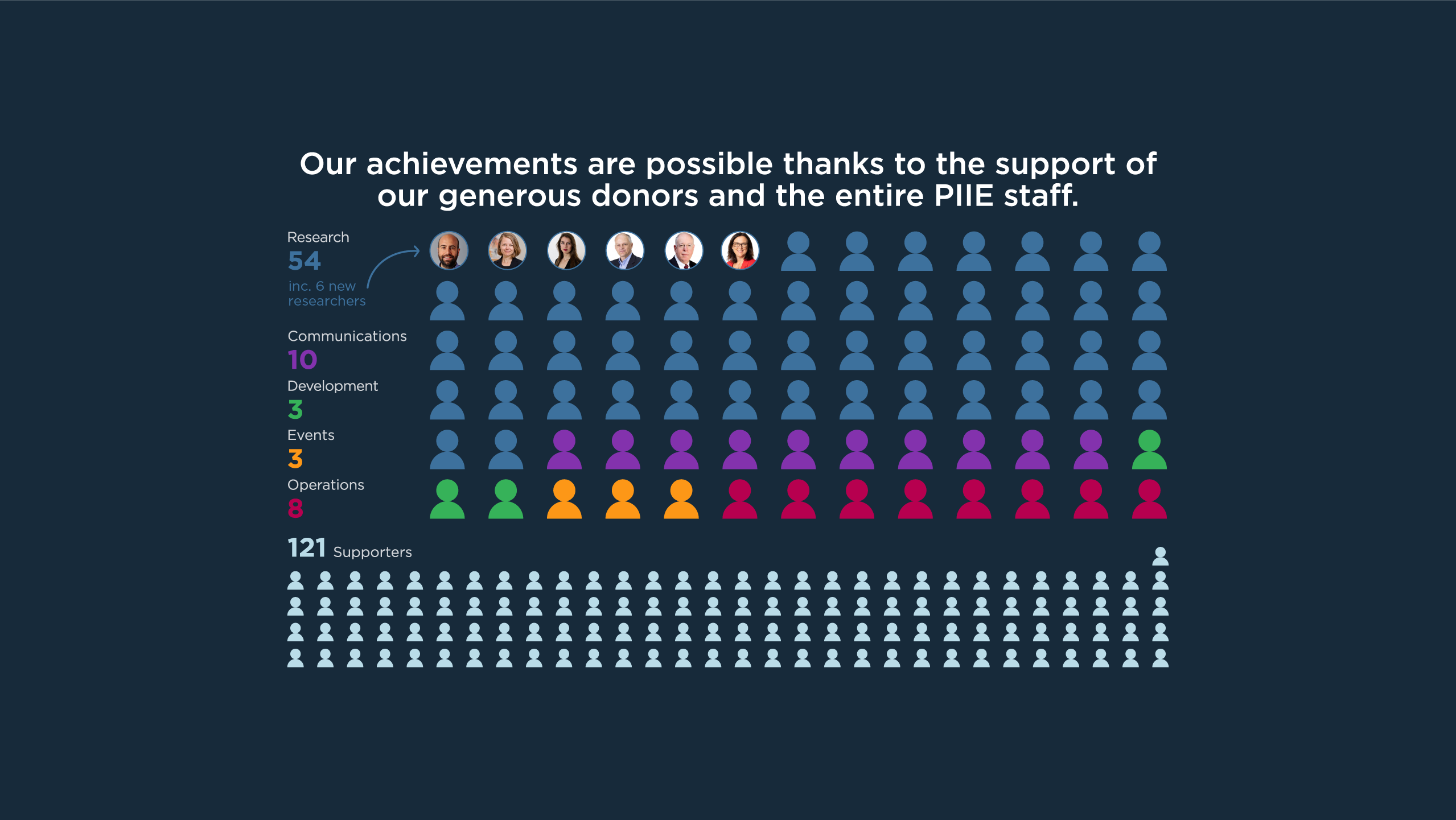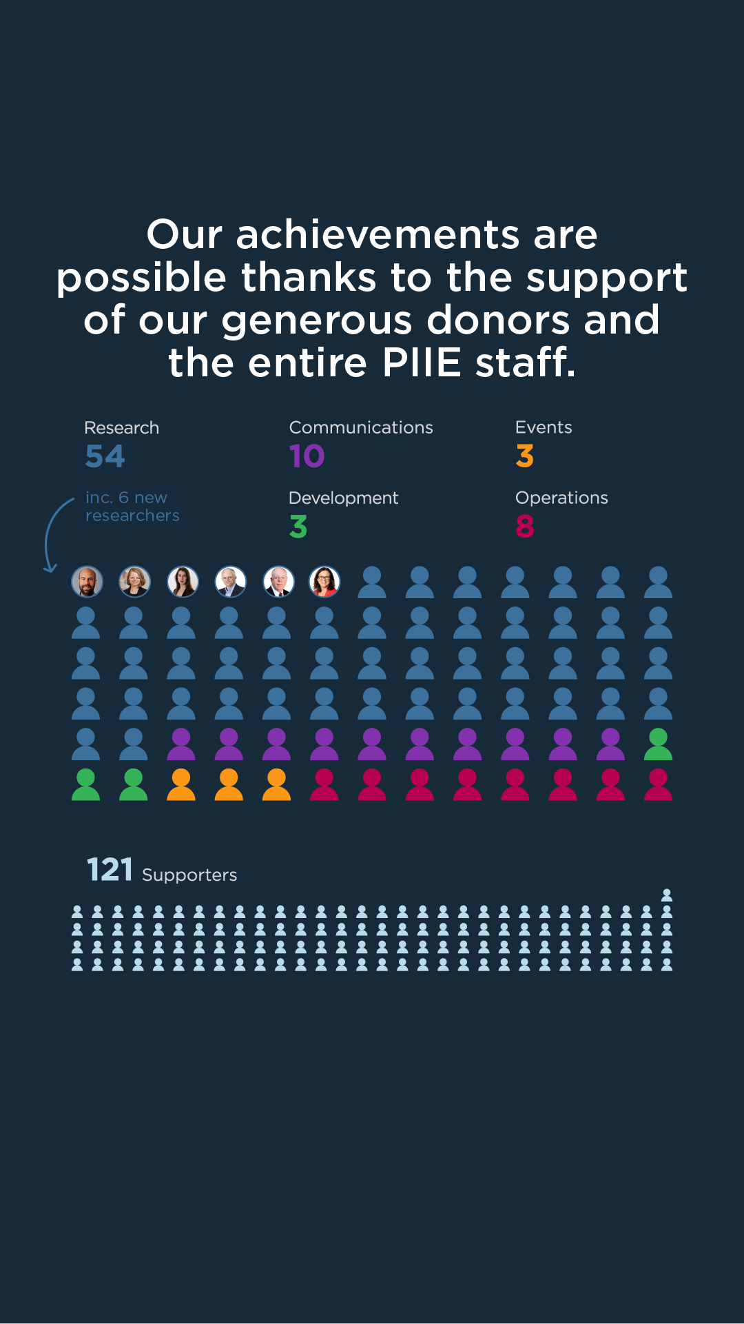 As always, I wish to express wholeheartedly our gratitude to our stakeholders and supporters—including individuals, private sector corporations, foundations, and government organizations—without whom we could not establish a beachhead of knowledge pushing back against a morass of self-interest and disinformation. I hope that you will enjoy scrolling through this annual report and take time to see the hard work and impressive results that the entire Peterson Institute team has achieved in the past year and the dedication that we promise in the future.