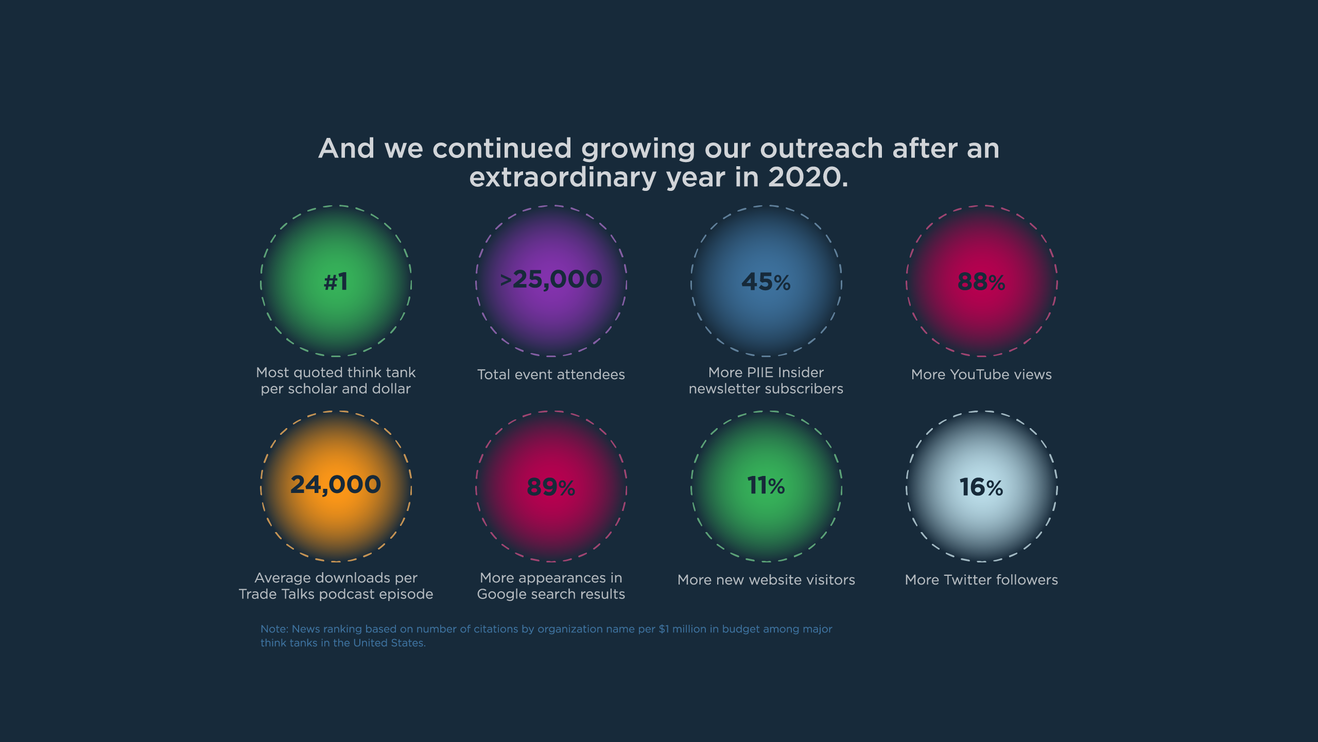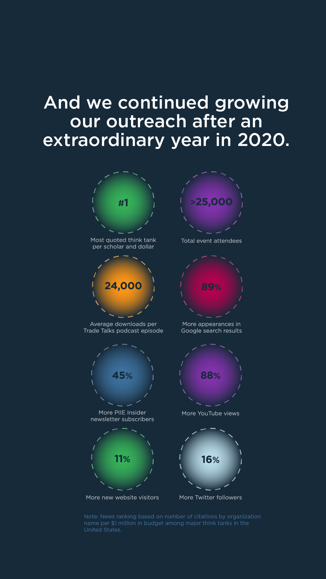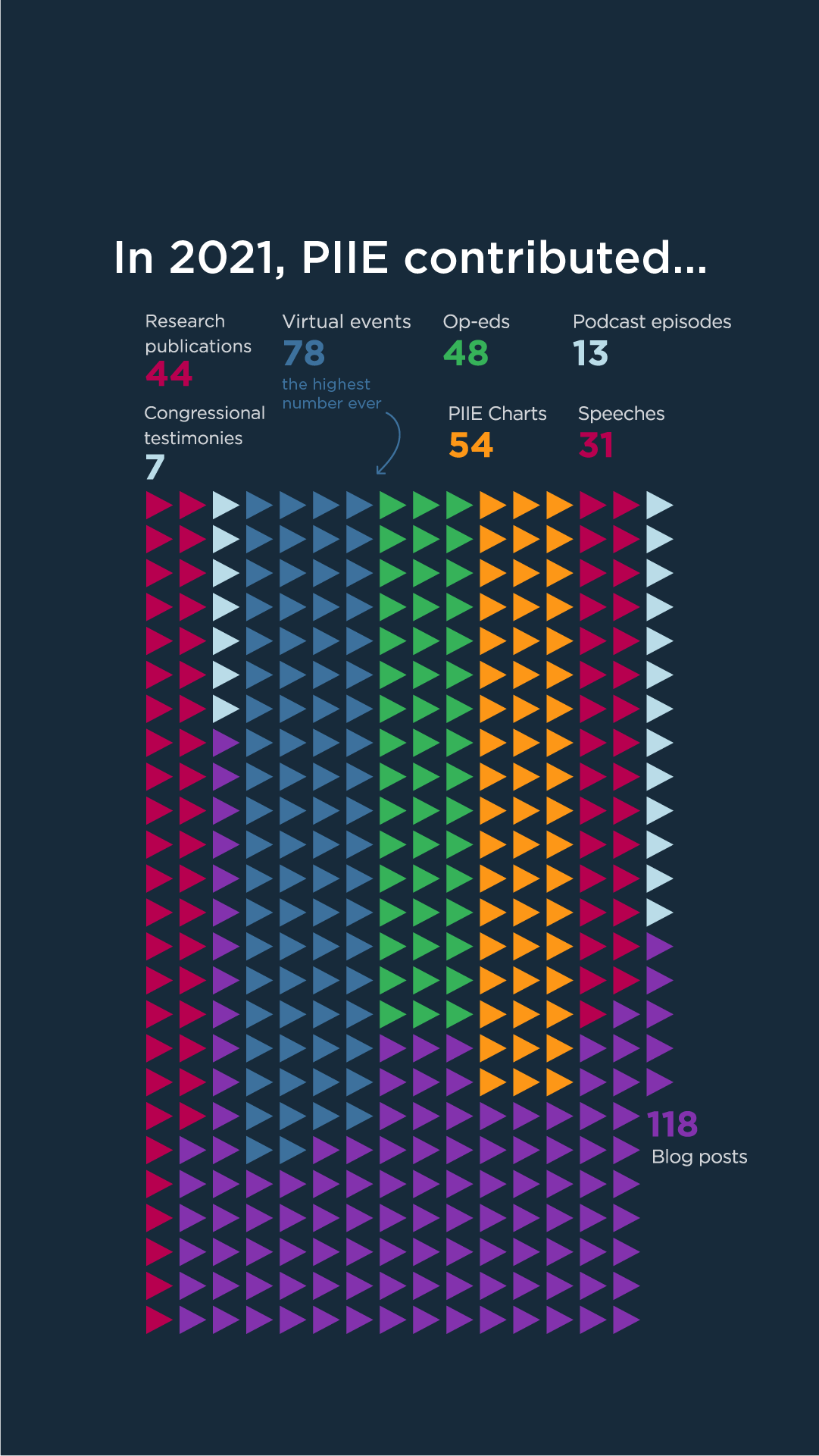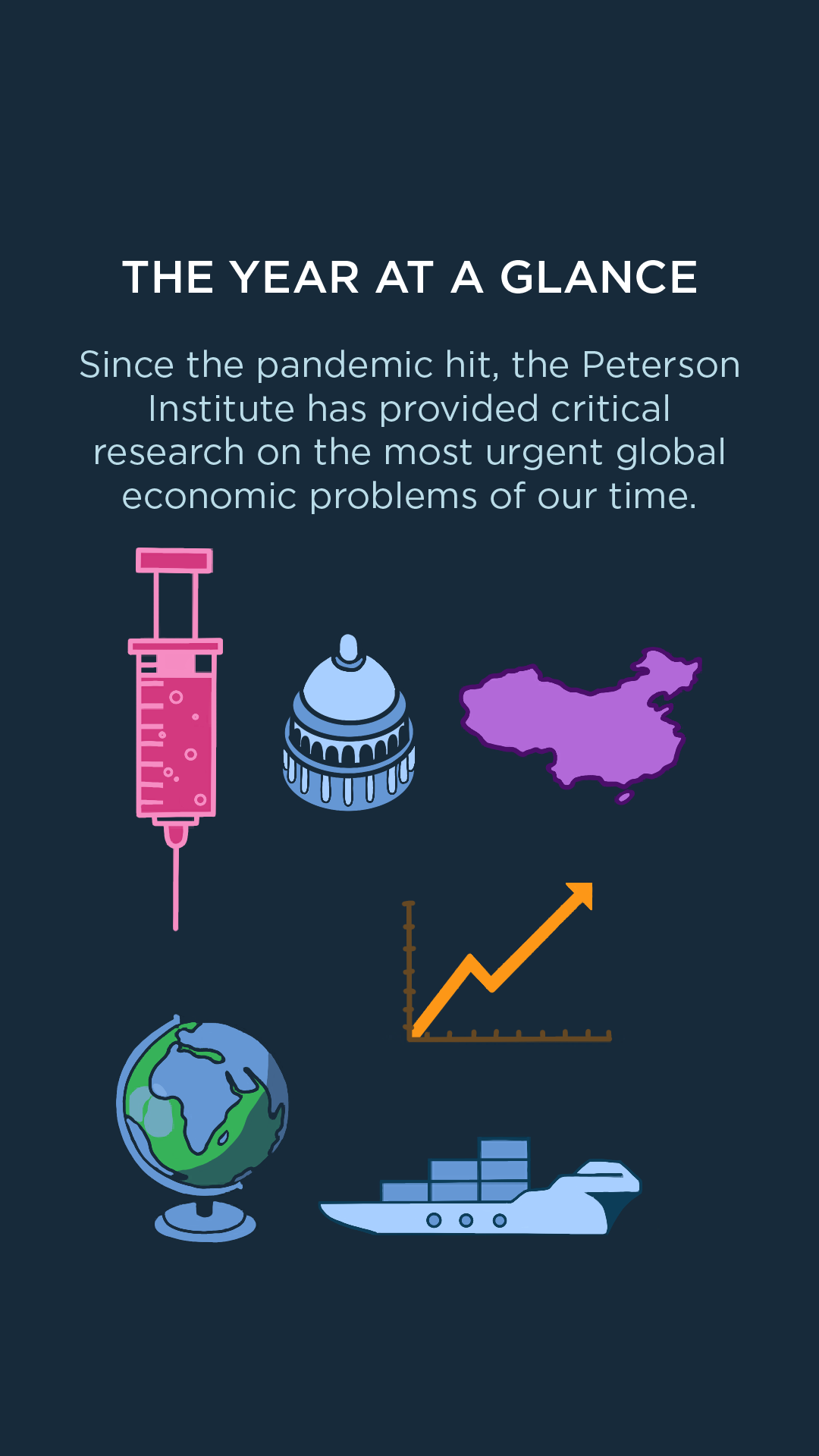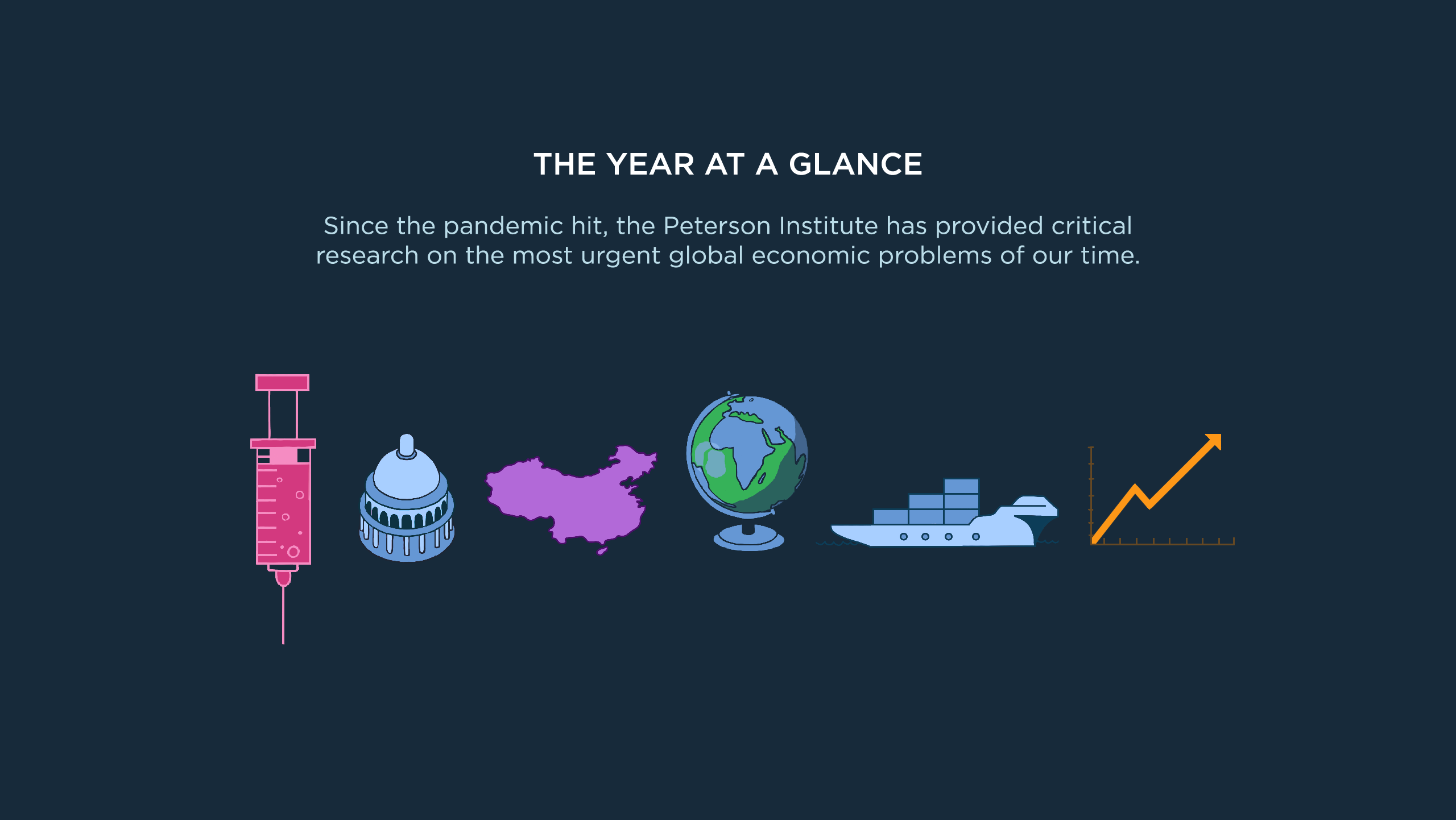 In this newly formatted Annual Report for 2021, I invite you to see why the Peterson Institute’s contribution to public understanding and problem-solving has never been more needed. You will see in this interactive presentation the work of Institute scholars over the past year and the agenda we have laid out for the year to come. You will also see how we have presented facts and objective research in the face of a rising tide of misinformation about trade, finance, and other aspects of globalization.