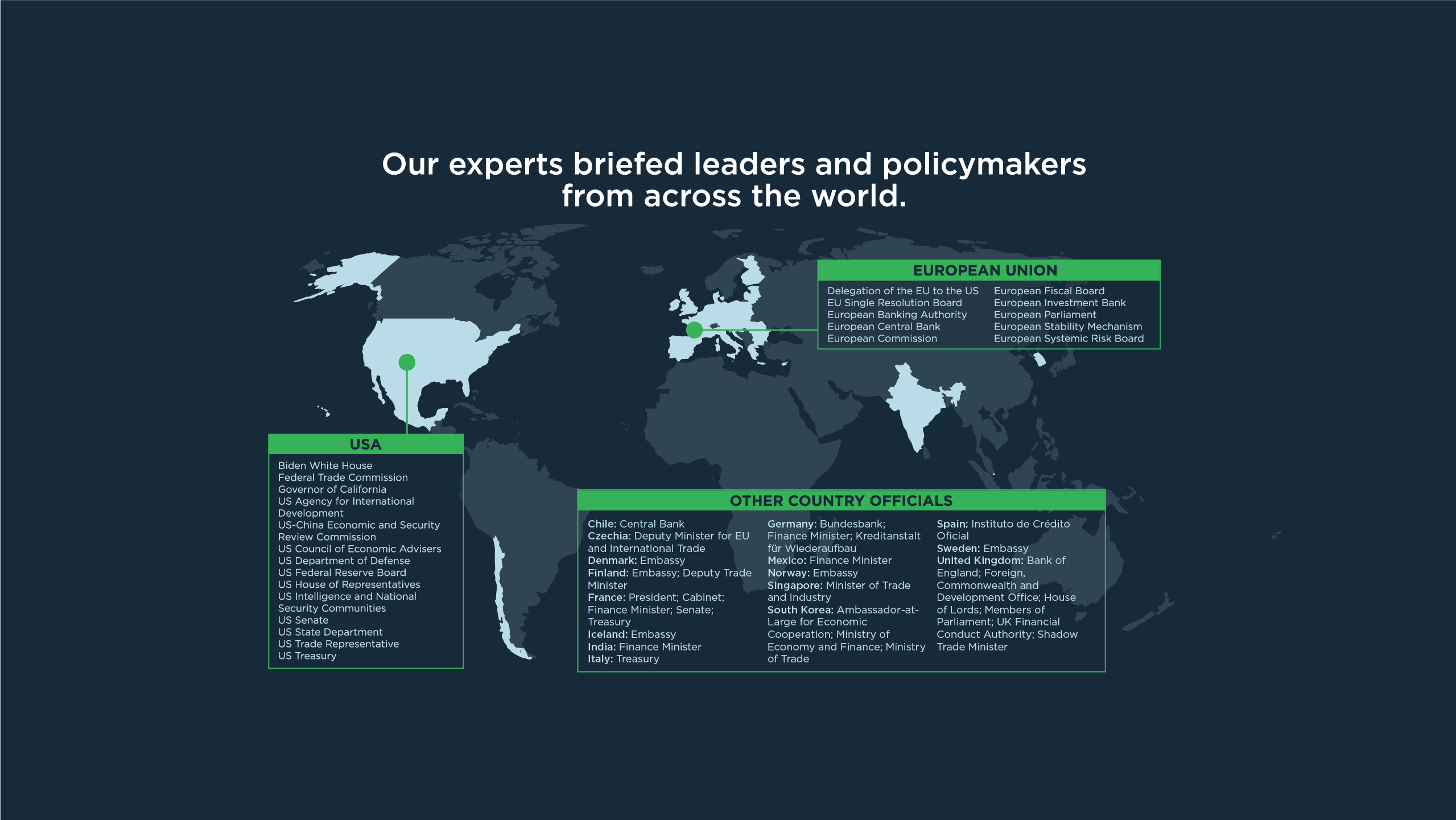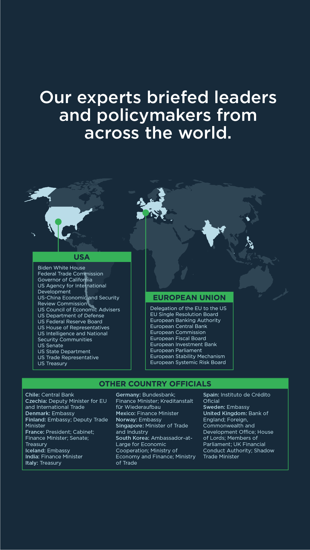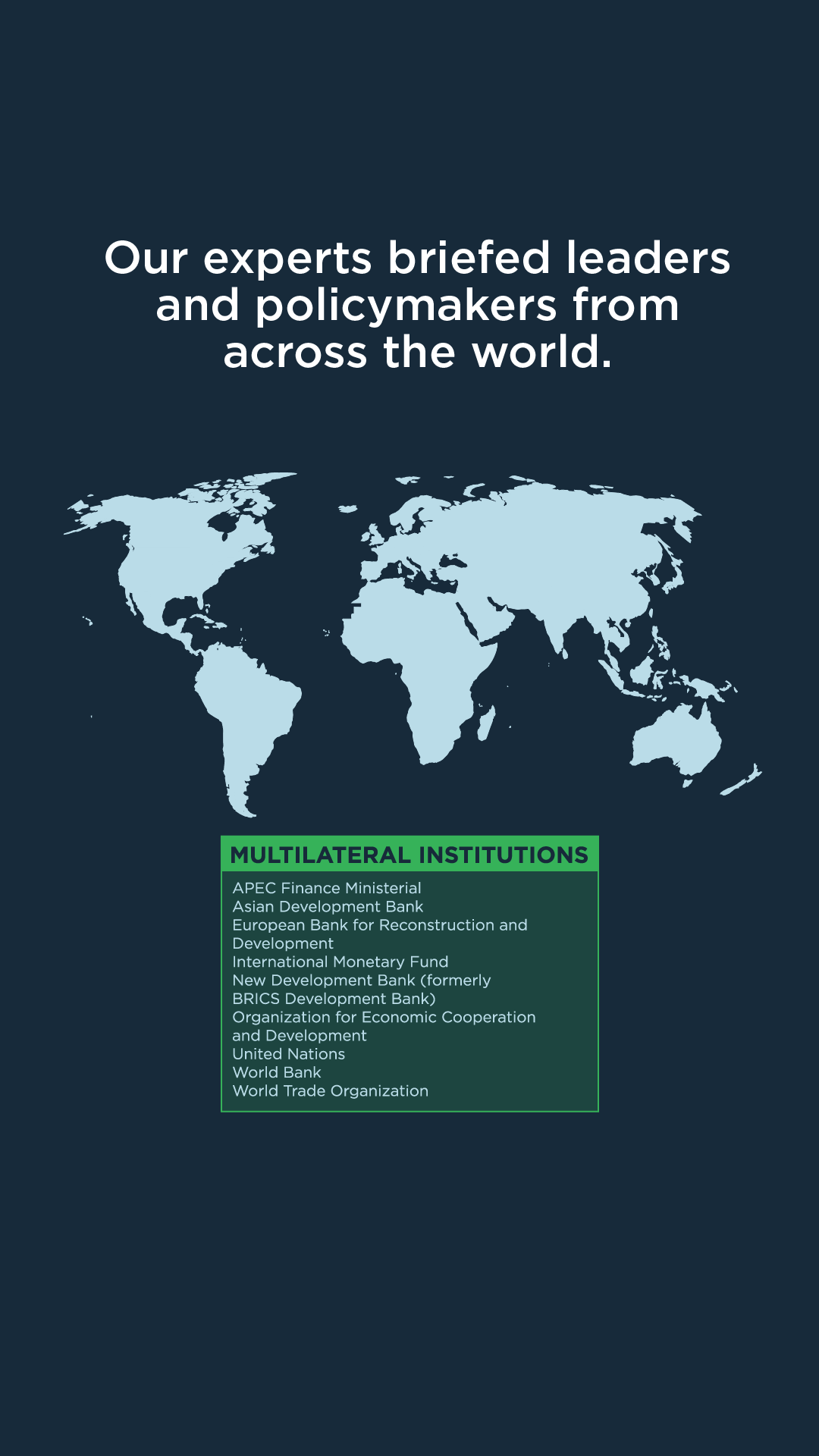 - Helping policymakers and business leaders improve resilience of global supply chains, particularly in critical sectors of medical goods, energy, and technology.