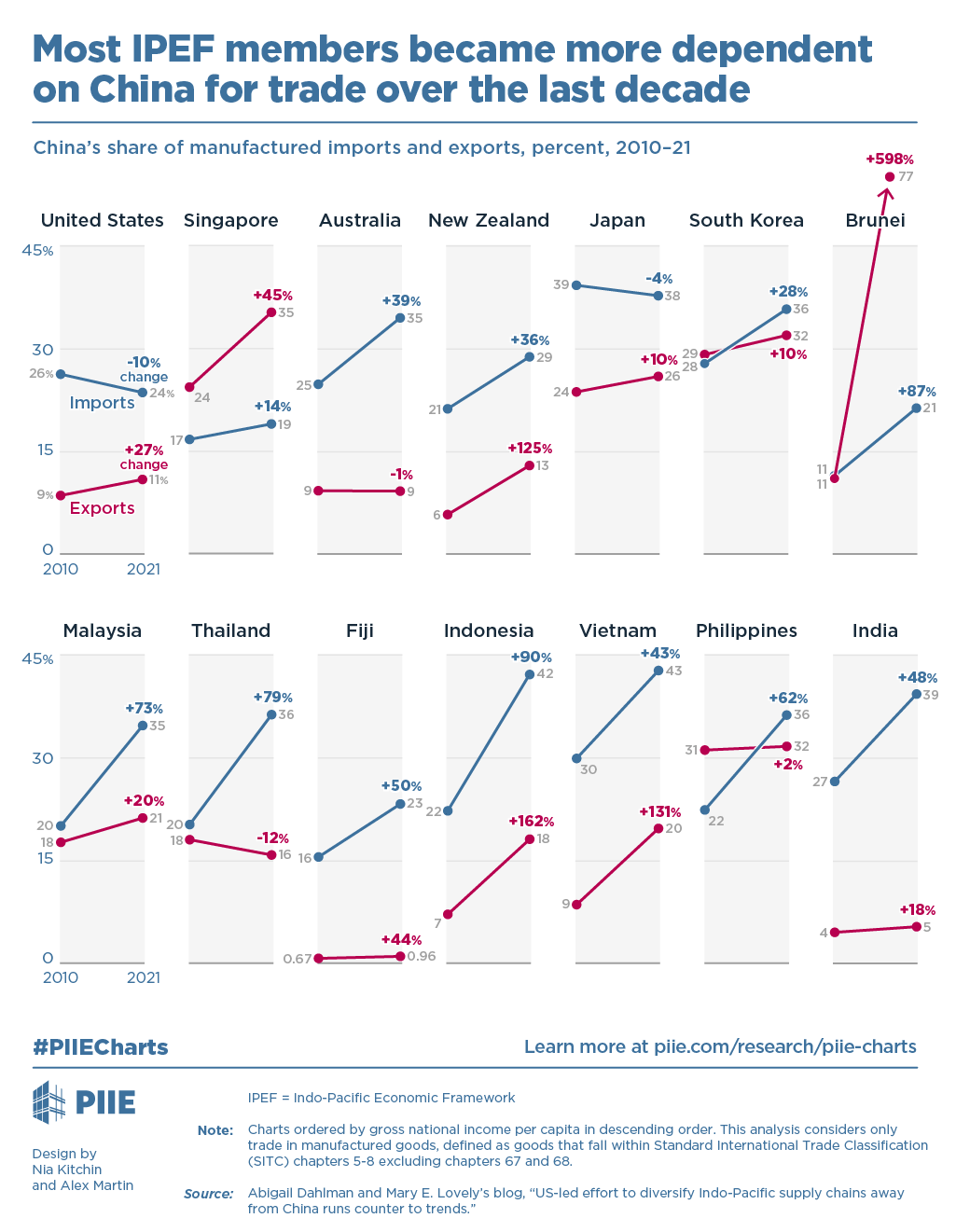PIIE Chart by Abigail Dahlman and Mary E. Lovely, “Most IPEF members became more dependent on China for trade over the last decade.”
