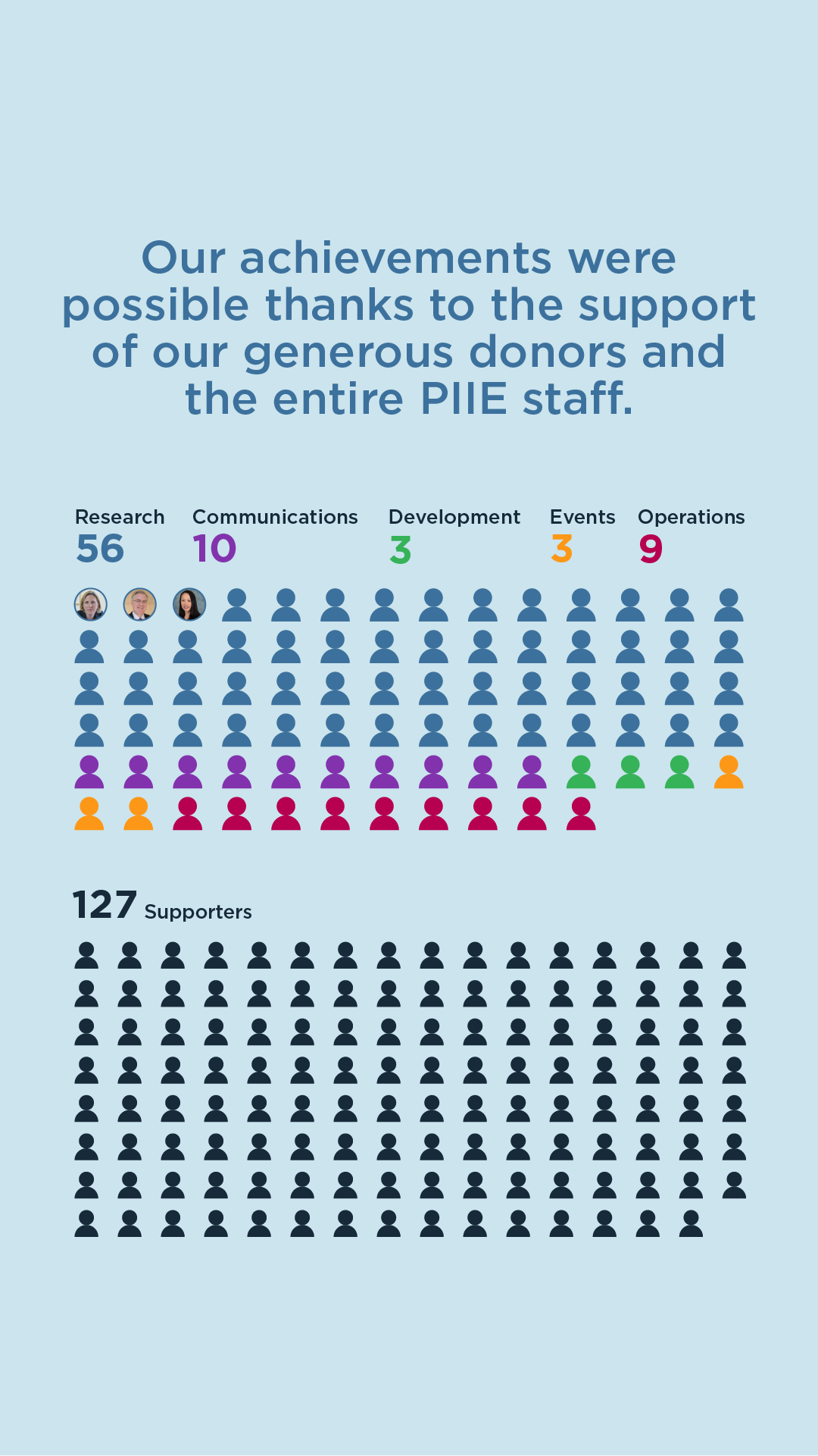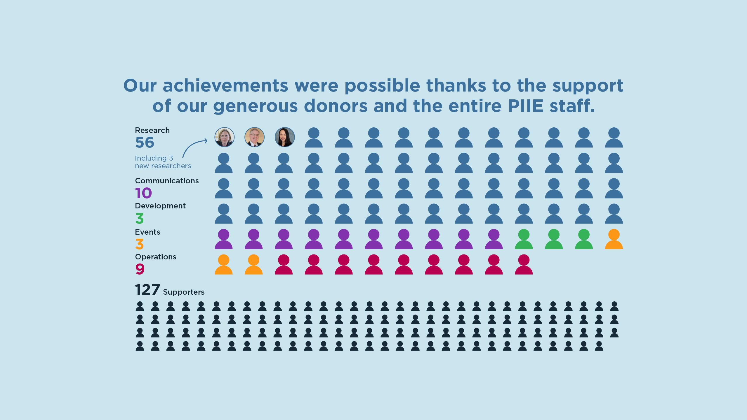 PIIE remains a bellwether for economic and policy analysis for the media and public, attracting outsized news coverage for our size. And our flagship PIIE Insider newsletter is more popular than ever. Starting in 2022, we returned to hosting events attended in person after two years of holding them exclusively virtually. We have several major in-person conferences this year for leading scholars and policymakers—on the 50th anniversary of floating exchange rates (held in March); on fiscal policy after COVID; and on the macroeconomics of climate change—for which featured research will also be live streamed to the general public.