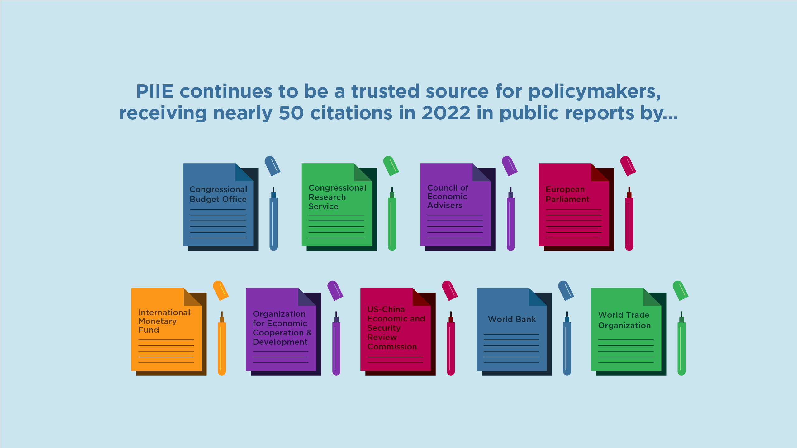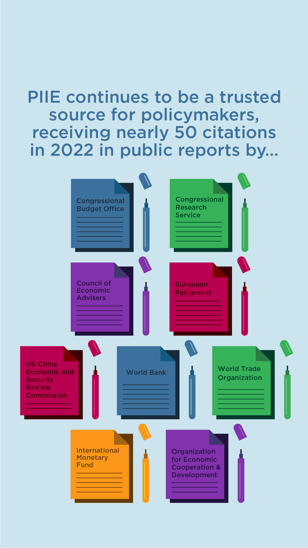 - The US-China Economic and Security Review Commission Annual Report to the US Congress cited PIIE authors 16 times, including research by Chad P. Bown, Joseph E. Gagnon, Cullen S. Hendrix, Tianlei Huang, Katheryn (Kadee) Russ, and Jeffrey J. Schott.