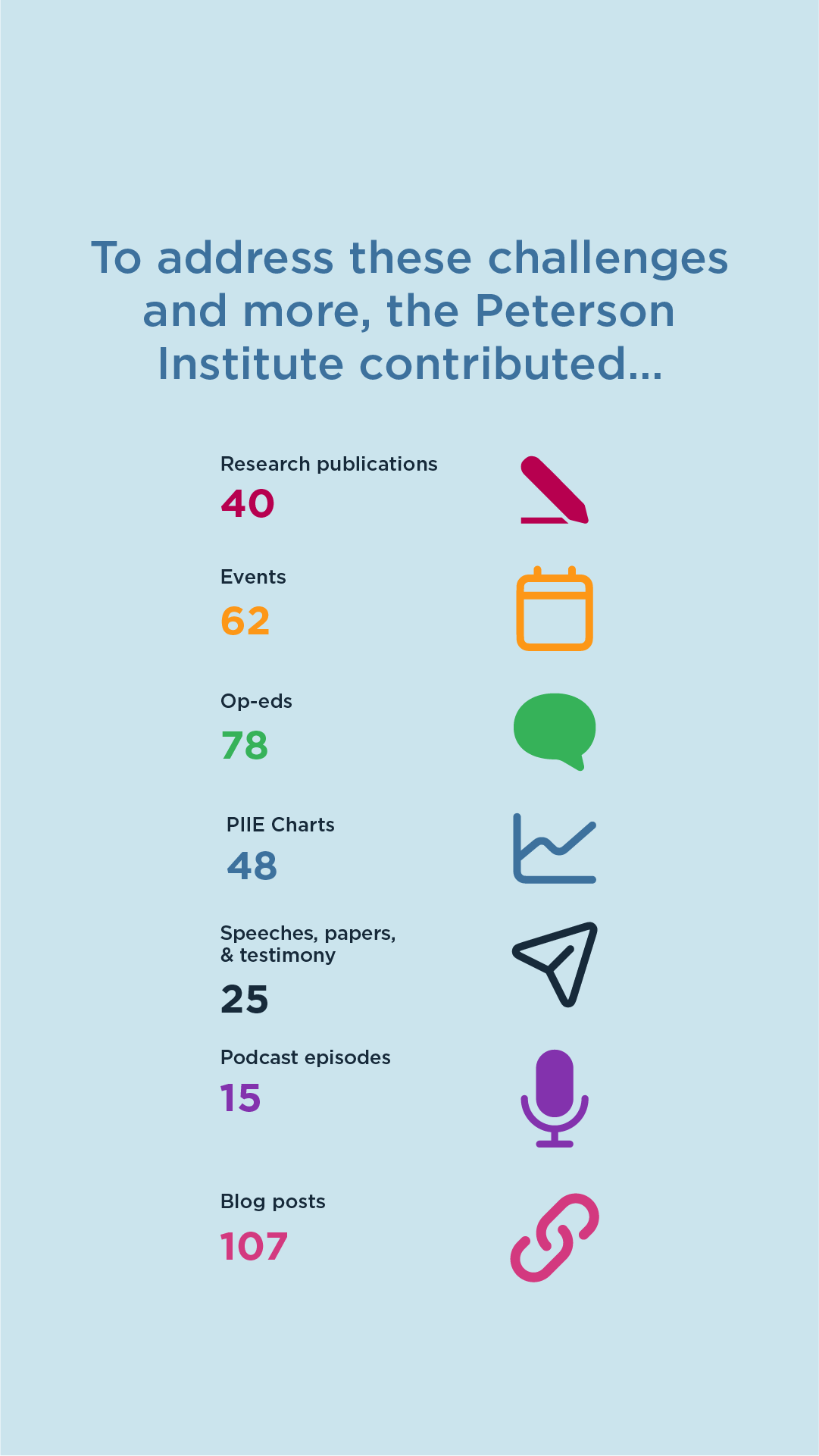 I invite you to review the Peterson Institute’s latest contributions to public policy and understanding at a time of increasing division in the global economy. Old threats to economic growth and stability have arisen anew in our era of commercial conflict and actual warfare. The Peterson Institute embraces its purpose to provide nonpartisan evidence-based and globally minded analyses of these challenges, even at the risk of inviting controversy. You will also see how we have tried to address another year of misinformation, mythology, and misrepresentations about trade, finance, and many other aspects of globalization.